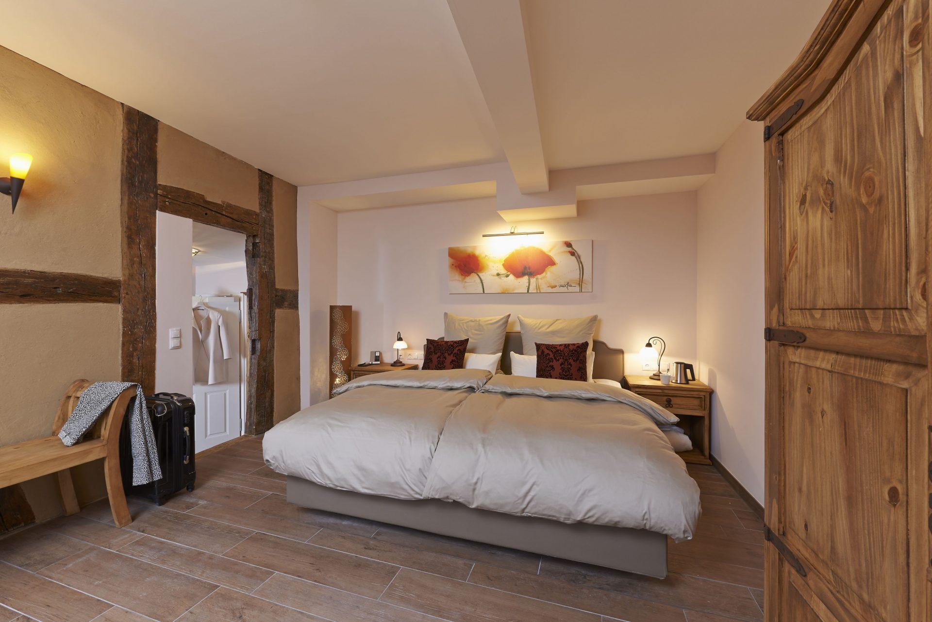 Dieses helle Zimmer verfügt über ein Luxusbett der Firma „Schramm“, Verdunkelungsvorhänge und Eichenmöbel.