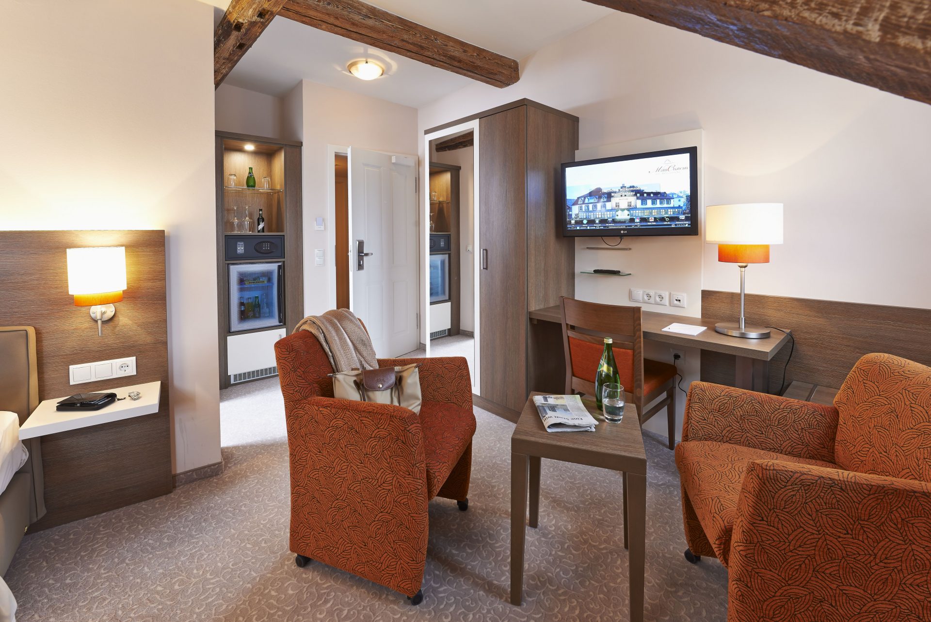 Dieses helle Zimmer verfügt über ein Luxusbett der Firma „Schramm“, Verdunkelungsvorhänge und Eichenmöbel.