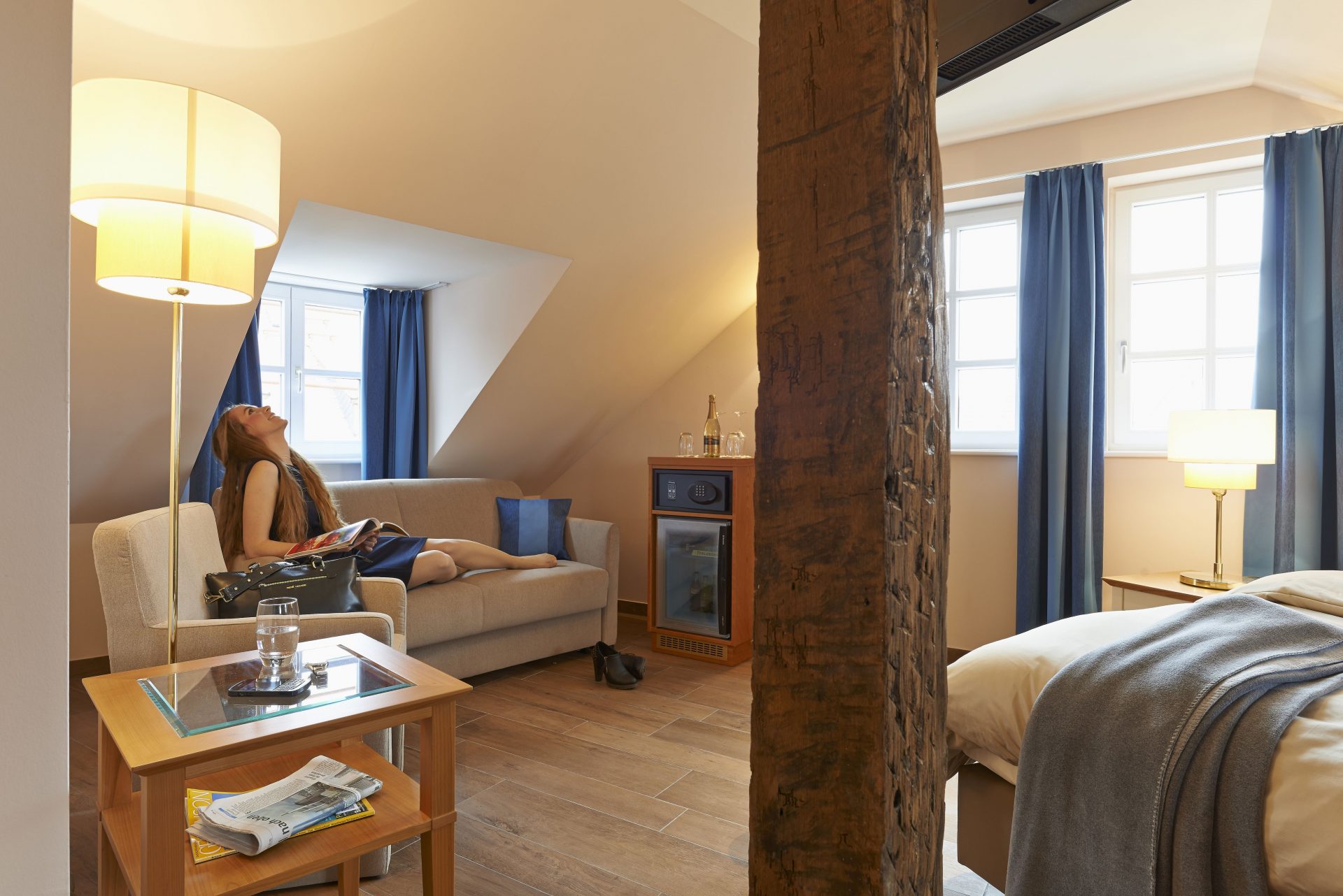 Dieses helle Zimmer verfügt über ein Luxusbett der Firma „Schramm“, Verdunkelungsvorhänge und Eichenmöbel.